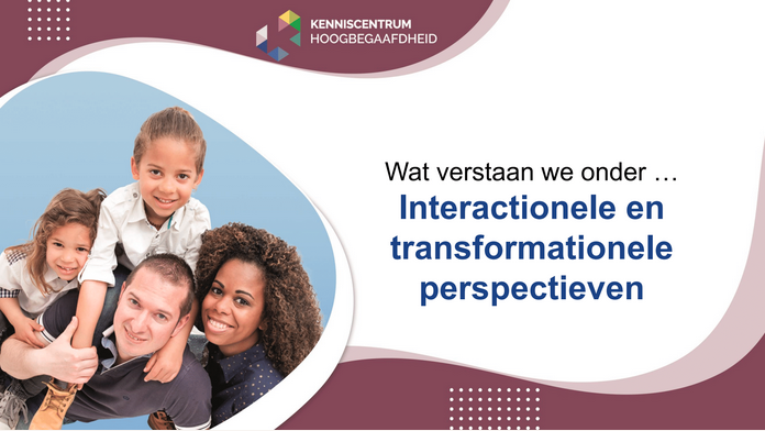 Bij hoogbegaafdheid zijn het interactionele en transformationele perspectief twee belangrijke manieren om talentontwikkeling te begrijpen. Het interactionele perspectief benadrukt dat hoogbegaafdheid ontstaat door de wisselwerking tussen aanleg en omgeving; genetische capaciteiten komen pas tot ontwikkeling wanneer de omgeving voldoende stimulans en kansen biedt. Het transformationele perspectief beschouwt hoogbegaafdheid als een dynamisch proces waarbij potentieel door ervaring, motivatie en gerichte begeleiding kan worden omgezet in daadwerkelijke prestaties of creatief werk. Samen laten deze perspectieven zien dat hoogbegaafdheid niet statisch is, maar afhankelijk van zowel omgevingsfactoren als persoonlijke inzet en groei.
