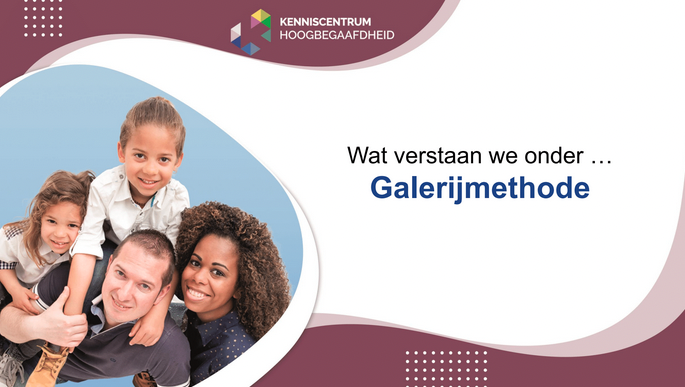 De galerijmethode is een creatieve werkvorm die wordt gebruikt om ideeën te verzamelen, delen en verbeteren binnen een groep. Deelnemers werken eerst individueel of in kleine teams aan voorstellen, die ze op posters of vellen papier presenteren. Vervolgens worden deze posters in de ruimte geplaatst als een soort “galerij”, zodat iedereen langs kan lopen, de ideeën van anderen kan bekijken en feedback of aanvullingen kan geven. Door deze interactieve aanpak worden verschillende perspectieven gecombineerd en ontstaan nieuwe inzichten. De methode stimuleert samenwerking, creativiteit en actieve betrokkenheid en maakt het makkelijker om overzicht te houden.
