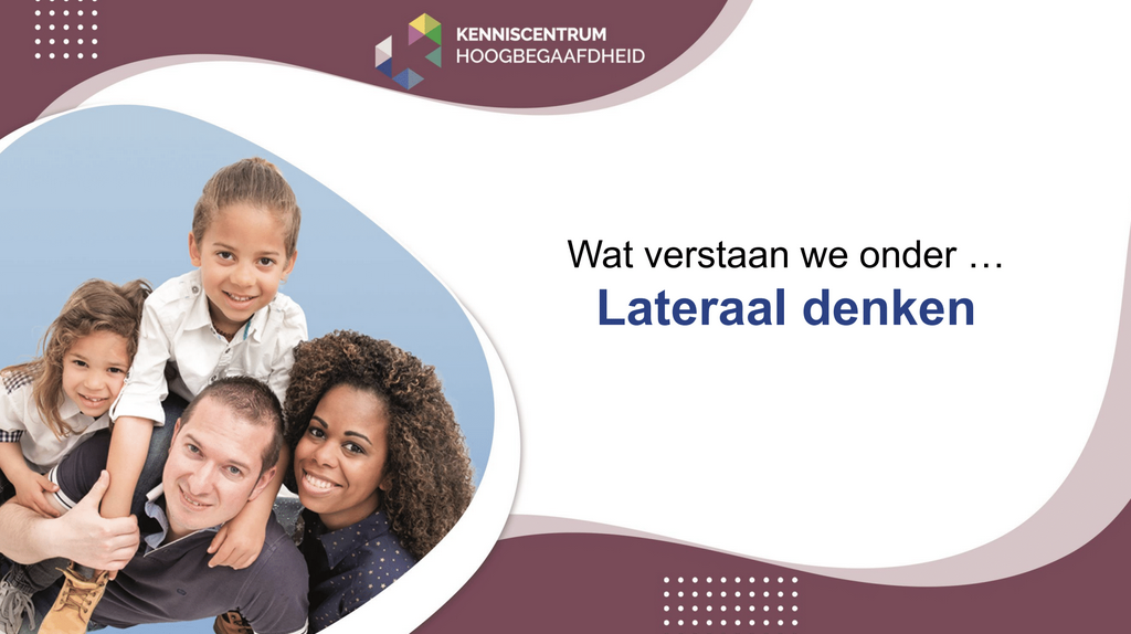 Lateraal denken is een creatieve manier van problemen oplossen waarbij standaard denkpatronen bewust worden doorbroken. In plaats van lineair of logisch te redeneren, zoek je naar onverwachte invalshoeken, originele vragen en alternatieve oplossingen. Dit type denken stimuleert innovatie en wordt vaak gebruikt in brainstormsessies of bij het ontwikkelen van nieuwe producten. Voorbeelden zijn het veranderen van uitgangspunten of het kiezen voor een onverwachte aanpak, zoals reizen op een ander tijdstip in plaats van sneller vervoer zoeken. Edward de Bono ontwikkelde technieken om deze vernieuwende manier van denken te stimuleren.